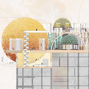 What makes a community center fun and playful? When looking at the previous programs of the Broadway Trade Center, most of its appeal to the public came from its family friendly rooftop play areas, candy kitchen, and library available to all. In order to make the center approachable again, the design focuses on making the programs appealing through color and shape. Families will be able to enjoy a day out for fun and relaxation surrounded by colorfully lit dome forms in contrast to the monochromatic views of Downtown.